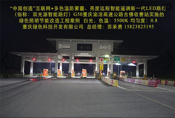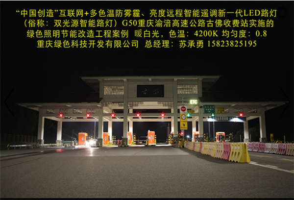 Division I (national high-tech enterprises) in Chongqing G50 Chongqing Fuling expressway toll station, the implementation of the "China Gufo creation" Internet plus color temperature, brightness and anti fog haze remote intelligent remote adjustment of a new generation of LED Street (commonly known as: Chameleon intelligent street lamp) green lighting project. In the highway lighting in the use of the Chinese creation "Internet plus color temperature, brightness and anti fog haze remote intelligent remote control of a new generation of LED street lamp and the intelligent control system, better stability, higher reliability, color, light response speed is more agile. It has four major characteristics: the technology has four major characteristics: (a) by PM2.5 sensor, temperature sensor, ultrasonic sensor, radar remote camera automatic acquisition of environmental protection, meteorology, transportation, security and other information, analyze the information sharing and data services through the cloud platform. (two) in different climate and season, according to the change of climate and environmental sensory needs people, through the temperature sensor, humidity sensor, PM2.5 sensor, intelligent remote control to achieve a variety of lighting lamps, color temperature, improve the human sensory comfort. The remote intelligent control system automatically collects the temperature, rain, fog and haze data of the lighting environment, and intelligently regulates the light color temperature to be the most comfortable and safest lighting value (3000K-5700K). (three) the brightness of light can be remotely intelligently adjusted. In different time periods, different light intensity, different traffic flow, etc., through the photosensitive sensors, ultrasonic sensors, radar sensors and other intelligent control, to achieve a variety of brightness lighting mode. In different periods of light adjustment for a variety of lighting mode, including "daytime mode", "night mode", "summer mode" and "winter mode" and "anti haze mode", which greatly improve the saving rate, and effectively solve the tunnel lighting for saving electricity is widely adopted for closed control loop or interval lights cause lighting the dark zone, the presence of traffic safety problems. (four) the important parameters such as luminance uniformity, illuminance uniformity and energy saving rate are all better than the national standard of LED street lamps. A new generation of multi-color temperature LED intelligent street lamp, one can be used when more than one ordinary monochromatic temperature LED street lamp, the cost performance is higher, can improve the light efficiency of 10%, and prolong the service life of lamps more than doubled. Intelligent color matching and dimming lighting are more comfortable, safe and energy-saving. This product is our use of a number of independent patent technology (patent number: 201320842388, 201320028126, 2015204938054) R & D, manufacturing "China creation" Internet plus color temperature anti haze brightness remote adjustment of a new generation of LED intelligent lighting products, the science and technology novelty has won the "novelty search report" (No: J201508016831). That is the "China creation", the one and only LED lamps advanced technology application of intelligent manufacturing technology; it has been included in the "2015 annual scientific and technological achievements into the project" Chongqing City SME (small enterprises in Yuzhong 2015 No. 188), approved the establishment of Chongqing City Engineering Research Center [LED Intelligent Control Technology Chongqing 2015 technology development and reform No. 1865]; has been included in the "2016 Chongqing Internet plus pilot demonstration project", "2016 year Chongqing city technology innovation guidance project". Has obtained "Chongqing hi tech products", "Chongqing municipal industry new technology certification" certificate.