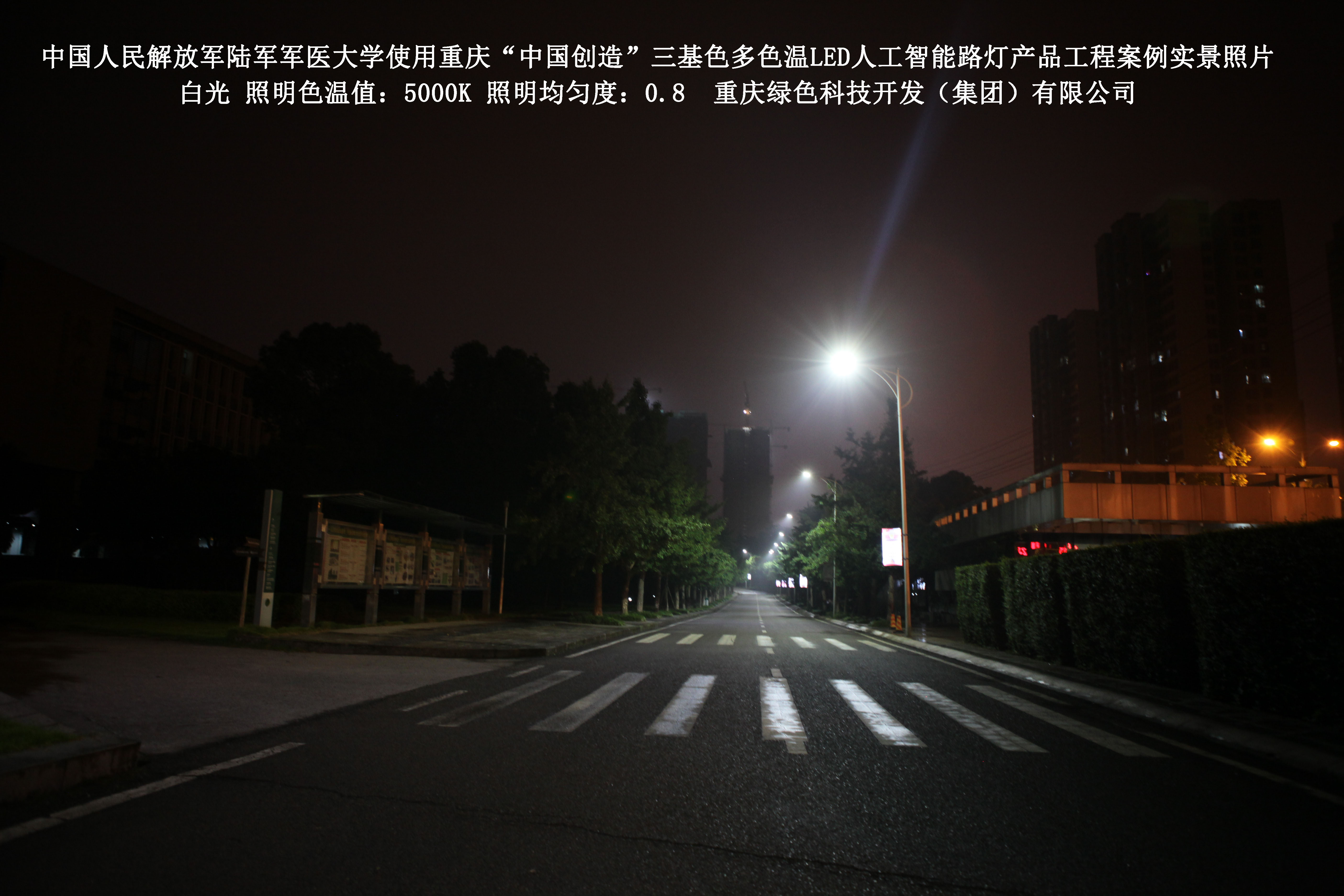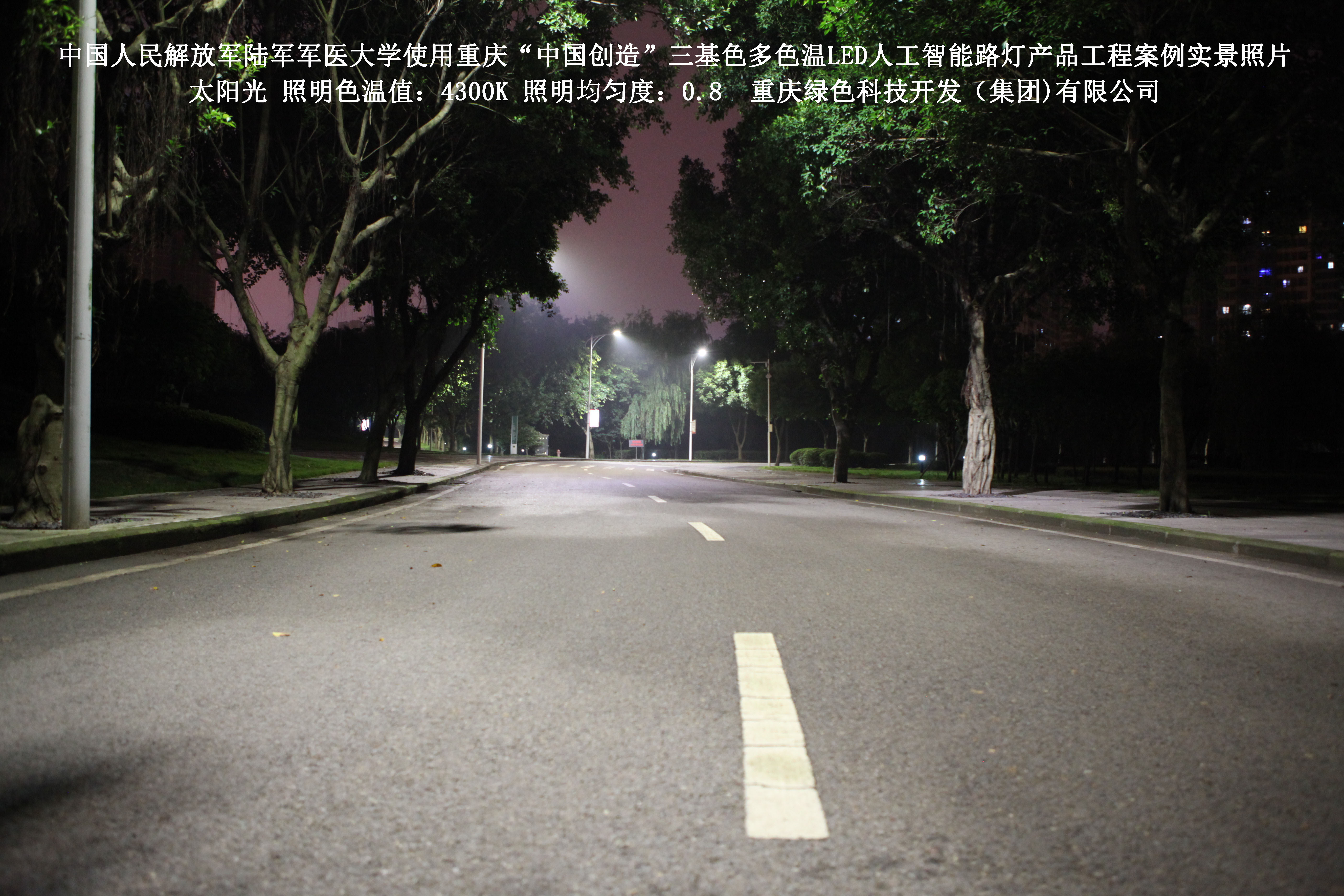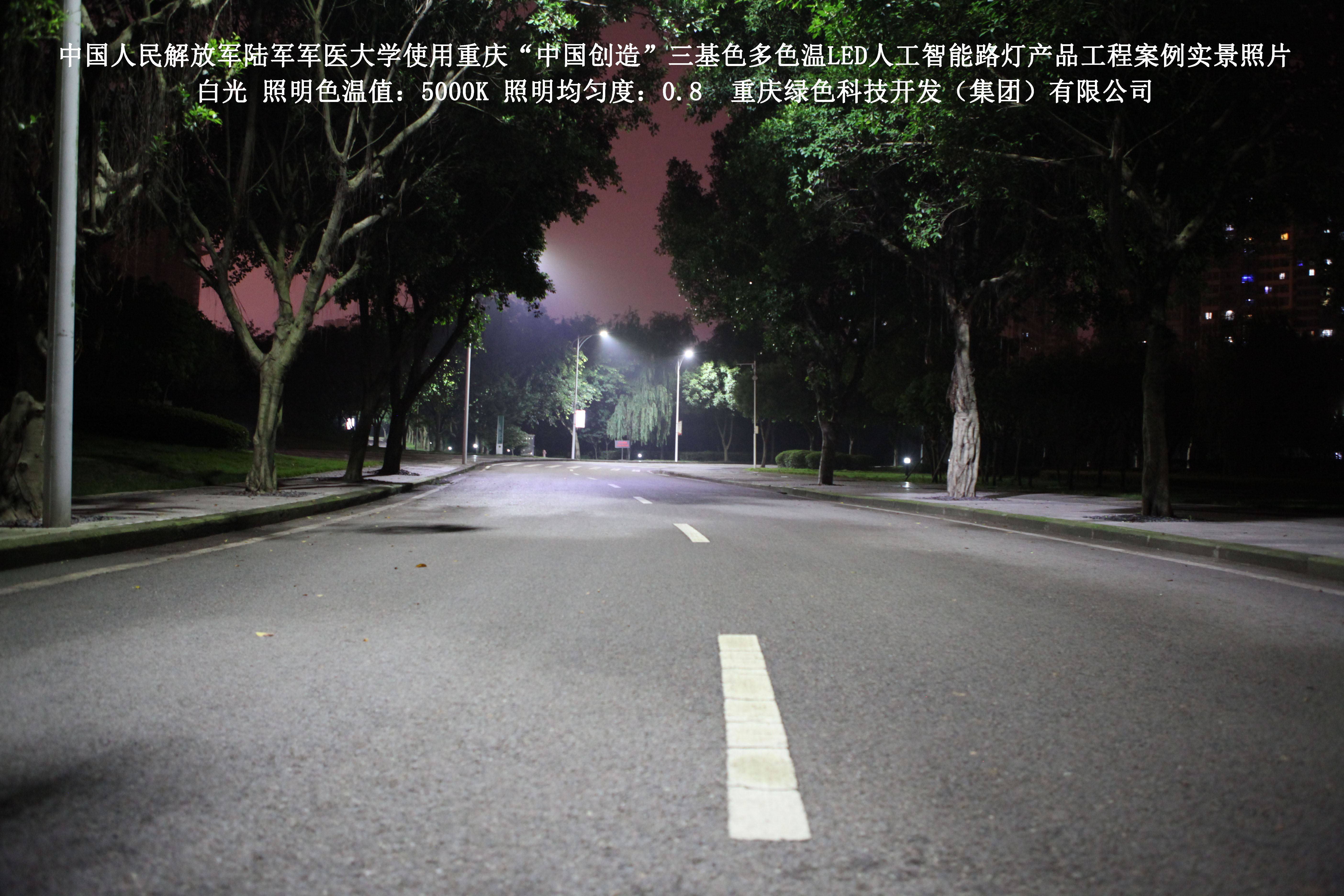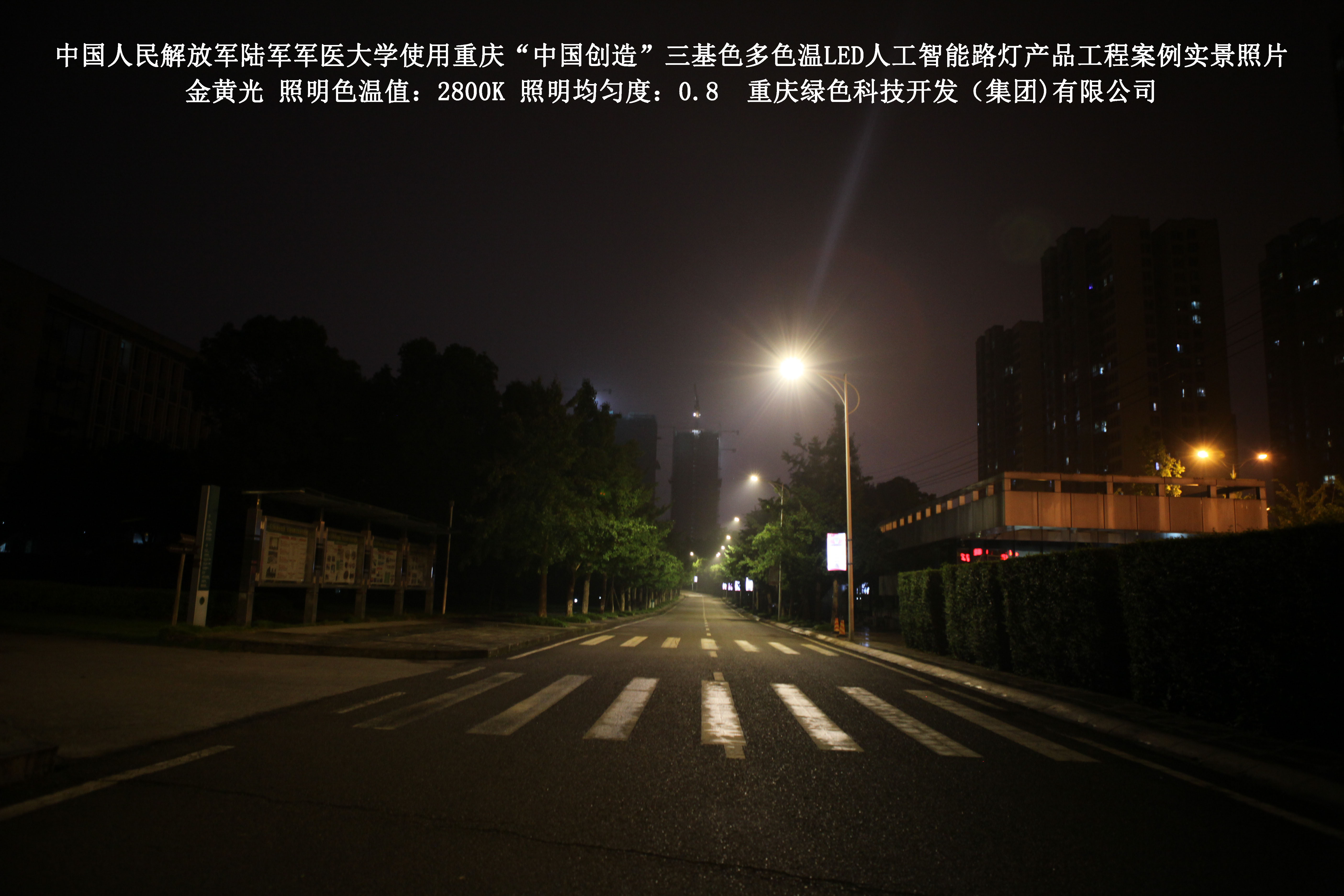 2018年4月,中國人民解放軍陸軍軍醫(yī)大學使用了我司研發(fā)制造的重慶“中國創(chuàng)造”三基色多色溫LED人工智能路燈,對沙坪壩大學城校區(qū)道路實施了綠色照明科技節(jié)能改造工程,該工程已全面竣工。工程實施后,極大地提高了照明清晰度、燈光均勻度、舒適度,實現(xiàn)城市路燈照明系統(tǒng)的智能化管理。
