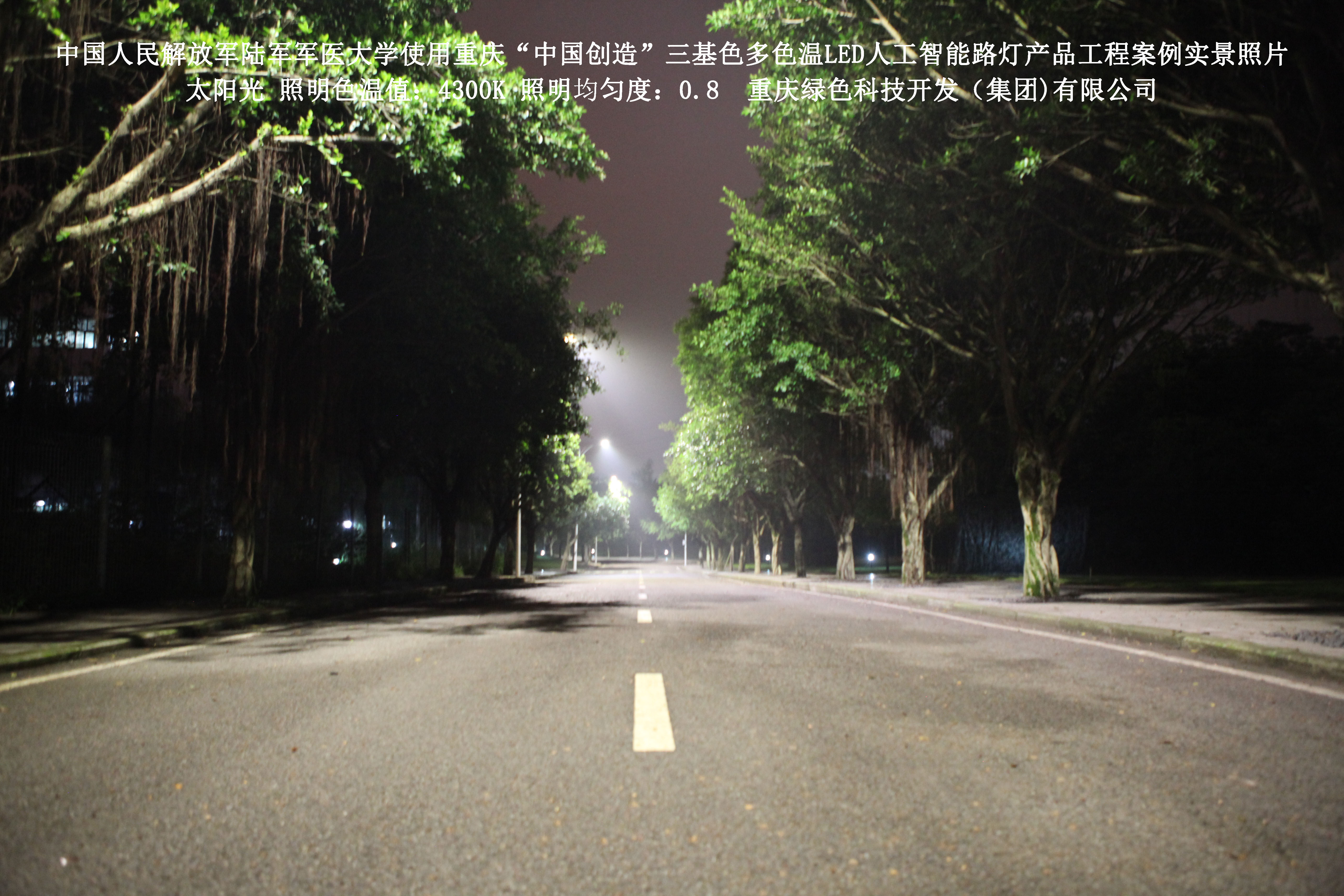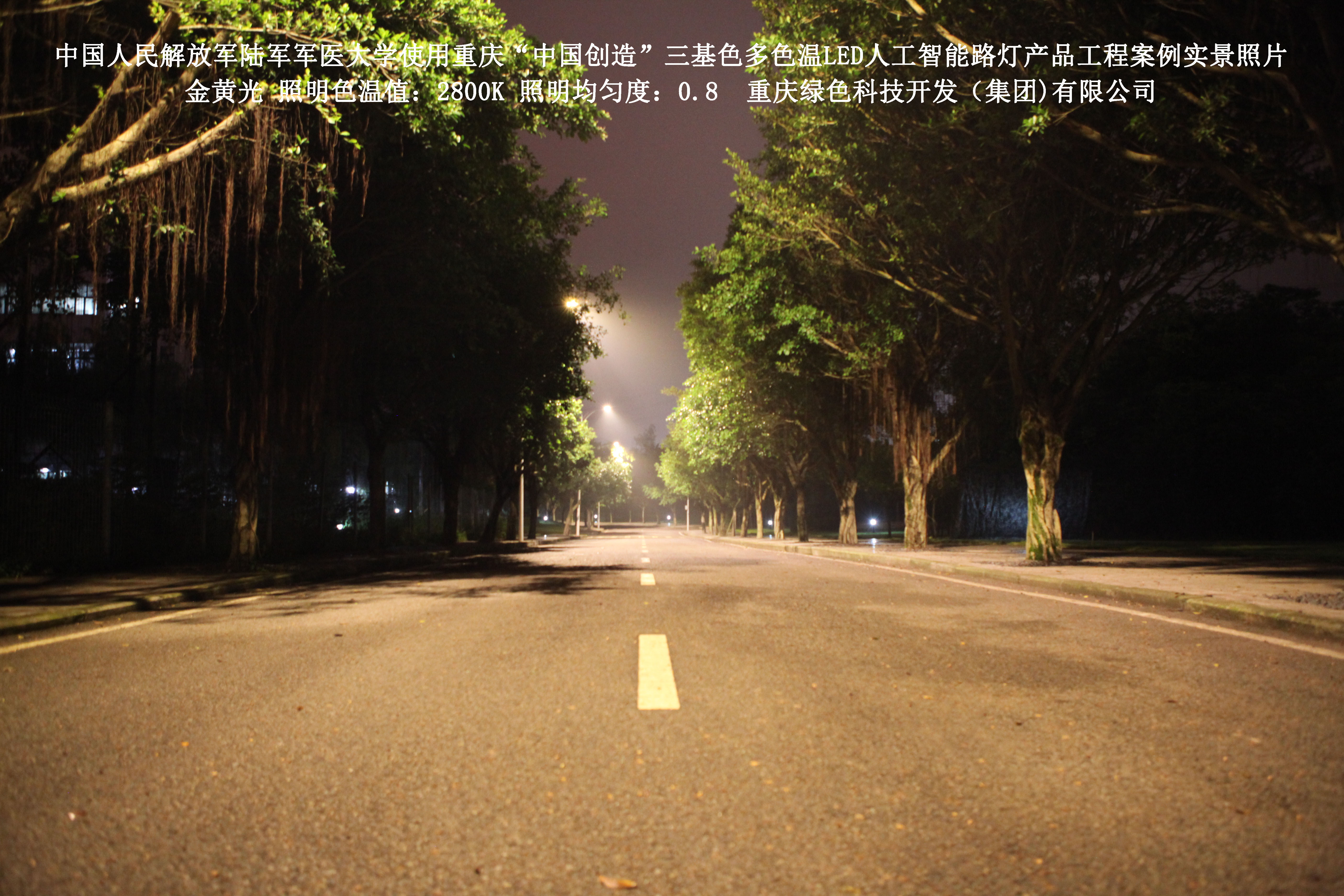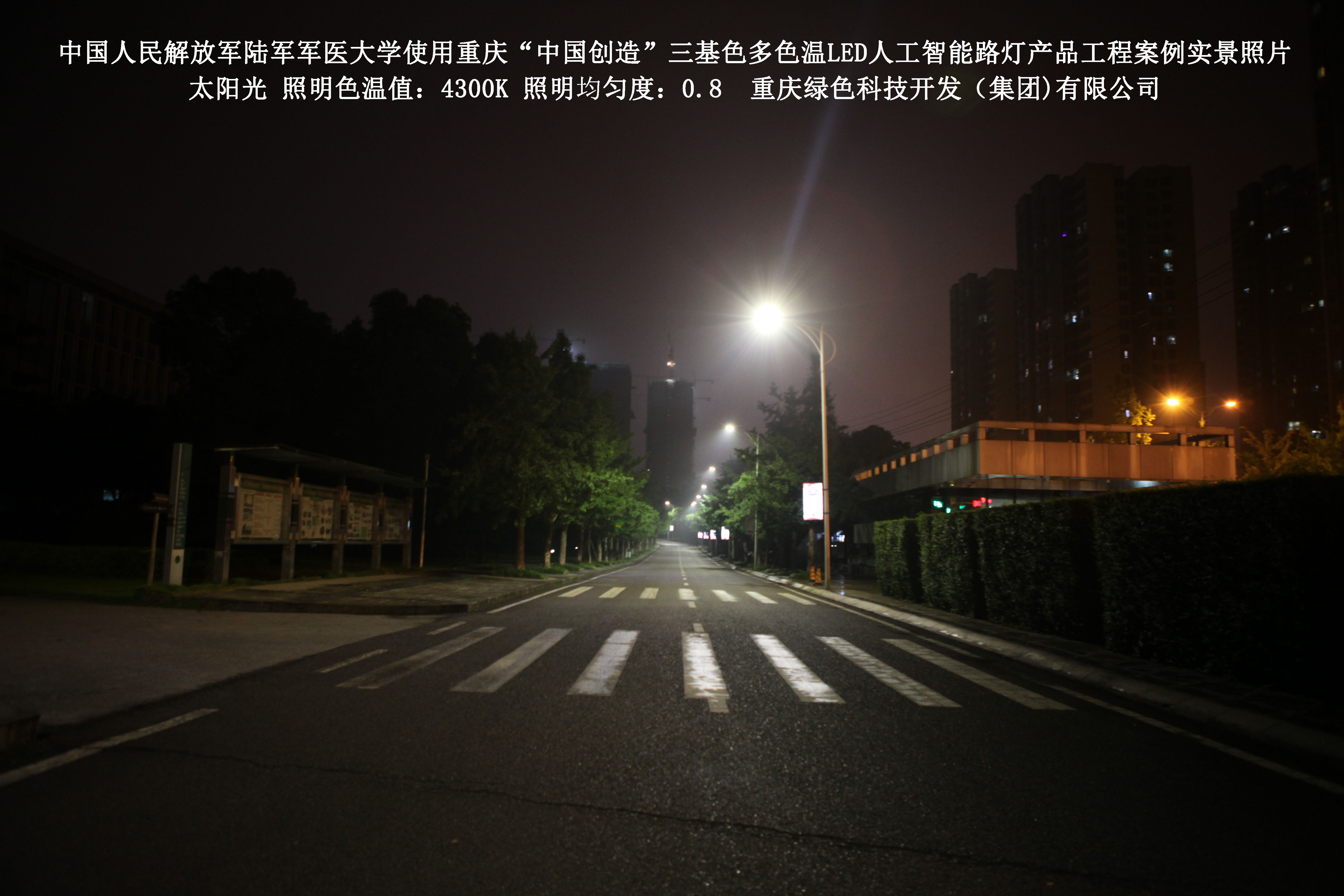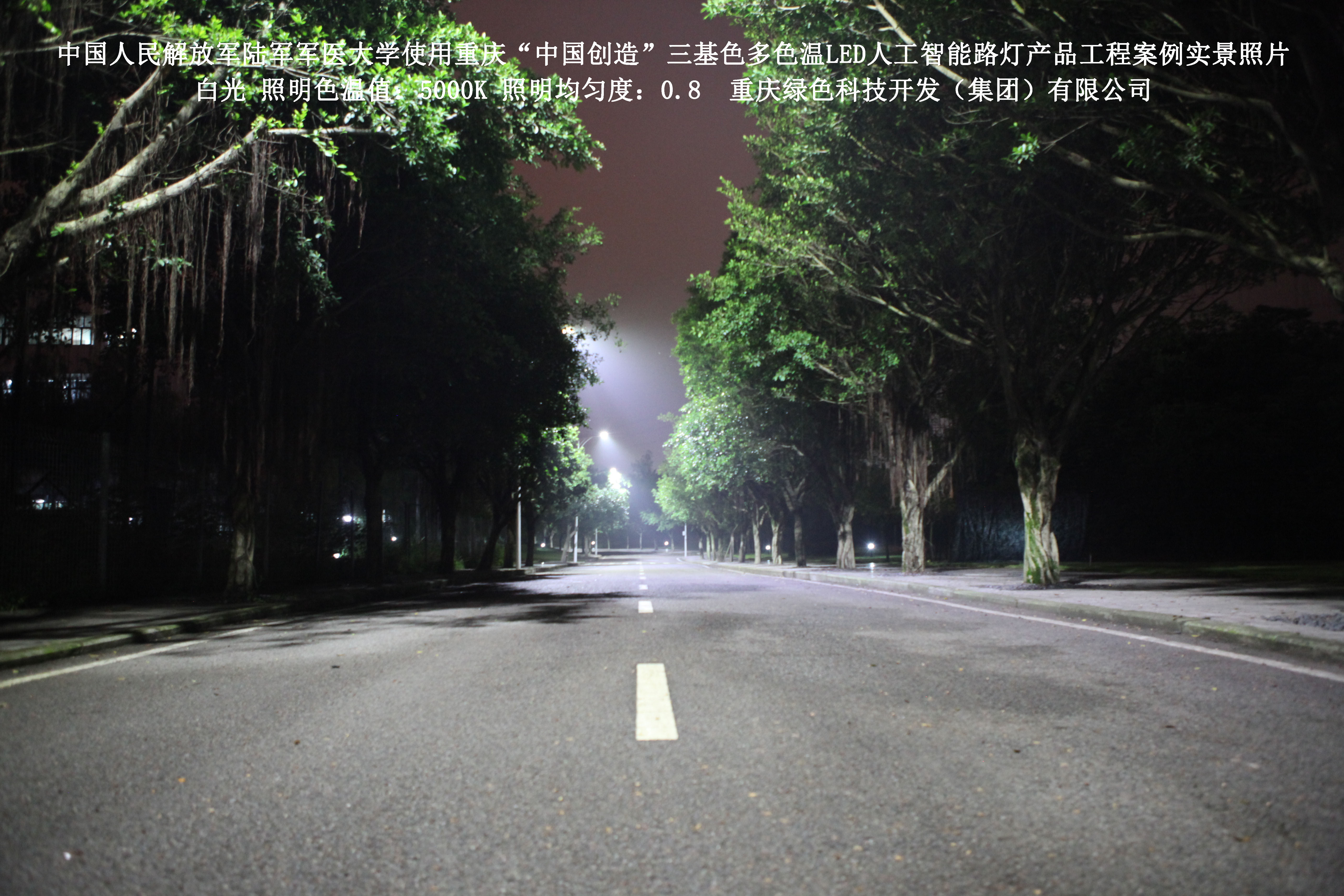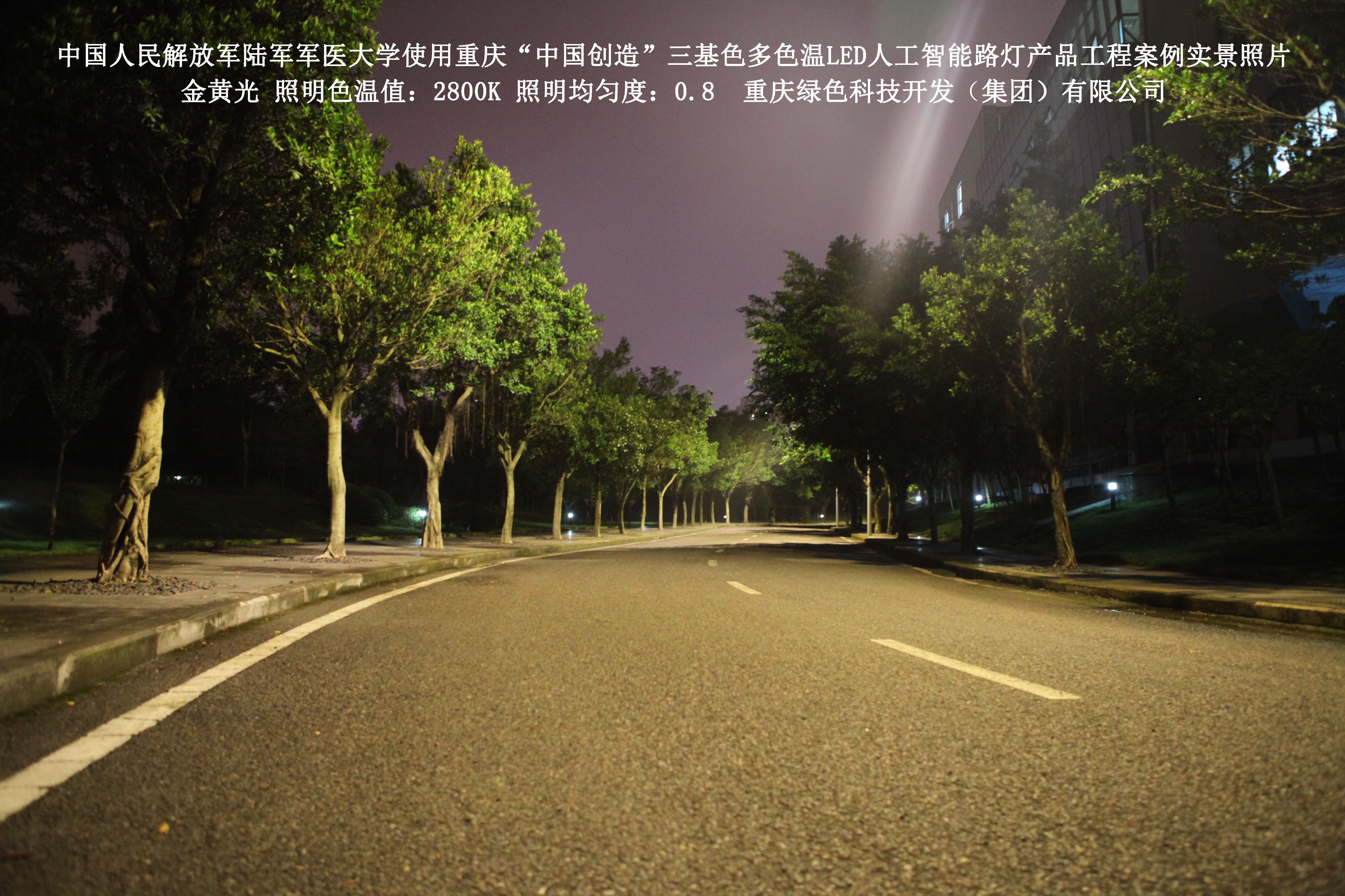 2018年4月,中國人民解放軍陸軍軍醫(yī)大學使用了我司研發(fā)制造的重慶“中國創(chuàng)造”三基色多色溫LED人工智能路燈,對沙坪壩大學城校區(qū)道路實施了綠色照明科技節(jié)能改造工程,該工程已全面竣工。工程實施后,極大地提高了照明清晰度、燈光均勻度、舒適度,實現(xiàn)城市路燈照明系統(tǒng)的智能化管理。