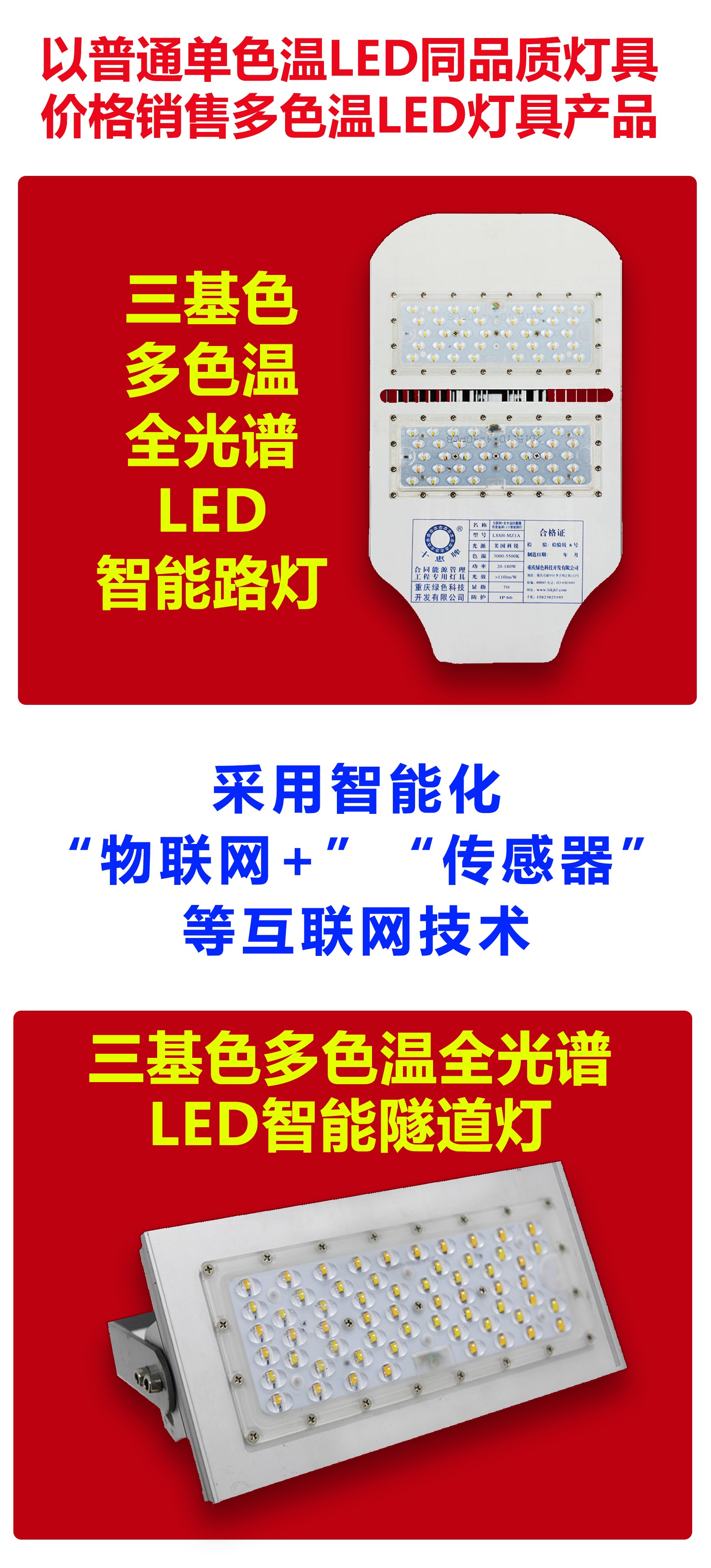 重慶“中國創(chuàng)造”三基色多色溫全光譜LED人工智能路燈技術(shù)是世界城市路燈照明領(lǐng)域淘汰普通單色溫LED路燈的先進(jìn)制造技術(shù),市場前景巨大。為了進(jìn)一步開拓多色溫LED智能路燈照明市場,重慶綠色科技開發(fā)(集團(tuán))有限公司(以下簡稱我司)擬尋覓誠實(shí)守信、具有實(shí)力的LED電源制造公司、LED路燈燈具制造公司合作,整合資源優(yōu)勢,免費(fèi)開放多色溫全光譜LED智能路燈、智能終端控制器制造技術(shù),在合作期間免費(fèi)提供國家級“智慧城市”城市照明夜景燈飾四級考評管理共享平臺使用,通過技術(shù)共享,實(shí)現(xiàn)共同對外銷售,達(dá)到雙贏的目的,請有意合作者與我們聯(lián)系……